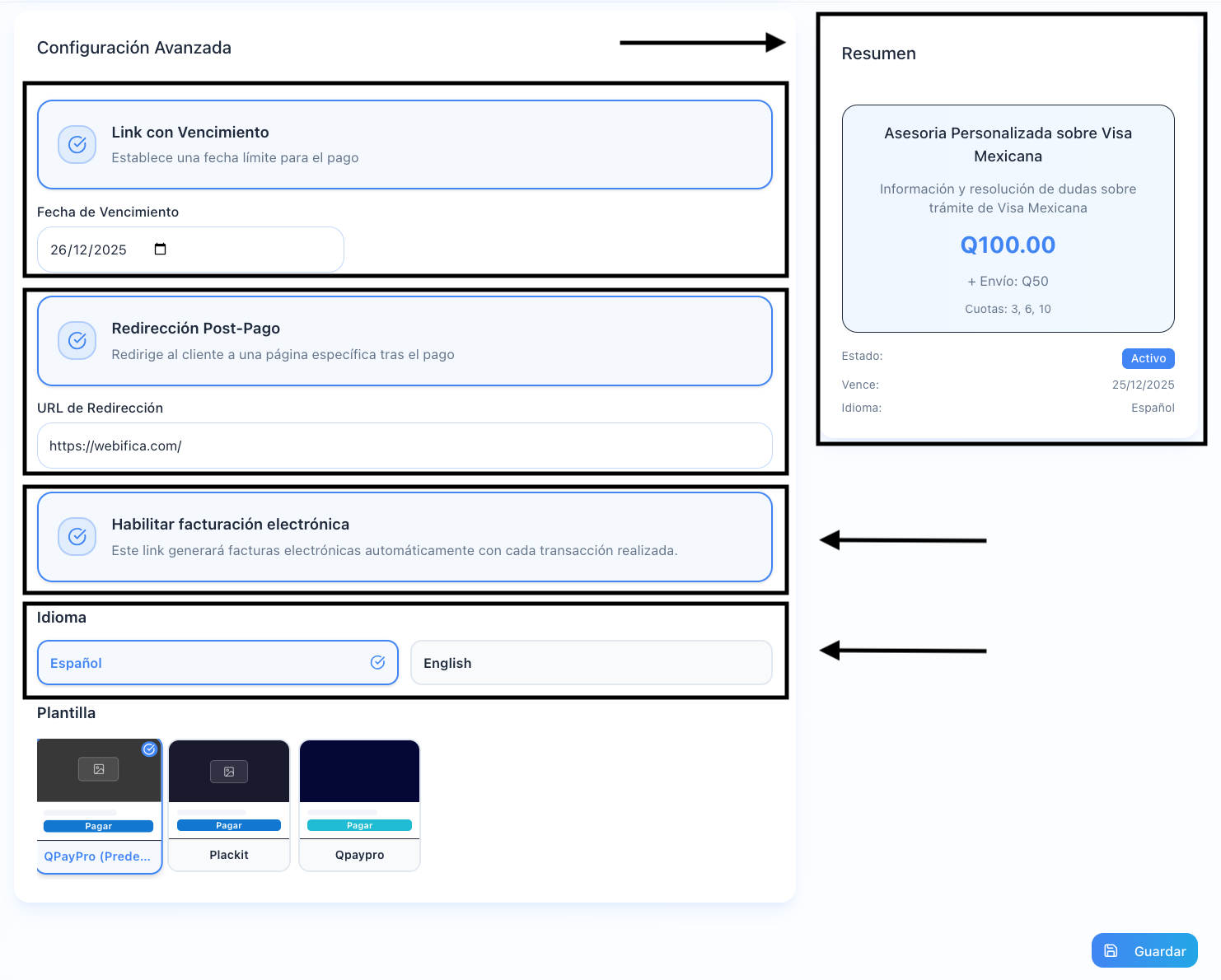 Al continuar desplazándote hacia abajo en la pantalla de creación del link de pago, encontrarás el apartado Configuración avanzada, donde podrás ajustar características adicionales que ofrece Qpaypro para personalizar tu link de pago.
