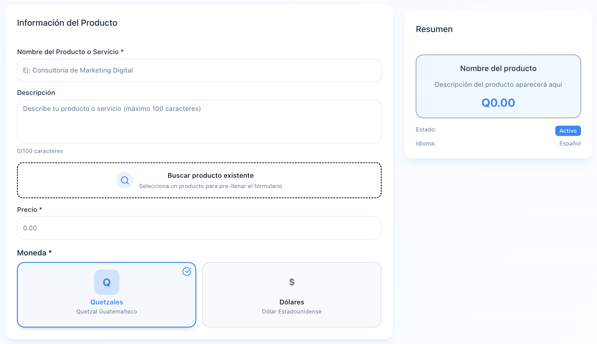 5.4 Moneda: Selecciona la moneda en la que se realizará el cobro. Puede ser Quetzales o Dólares, según la configuración de tu cuenta.
