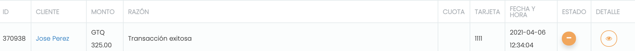 En el listado de transacciones, cada registro muestra desde la vista general la siguiente información: