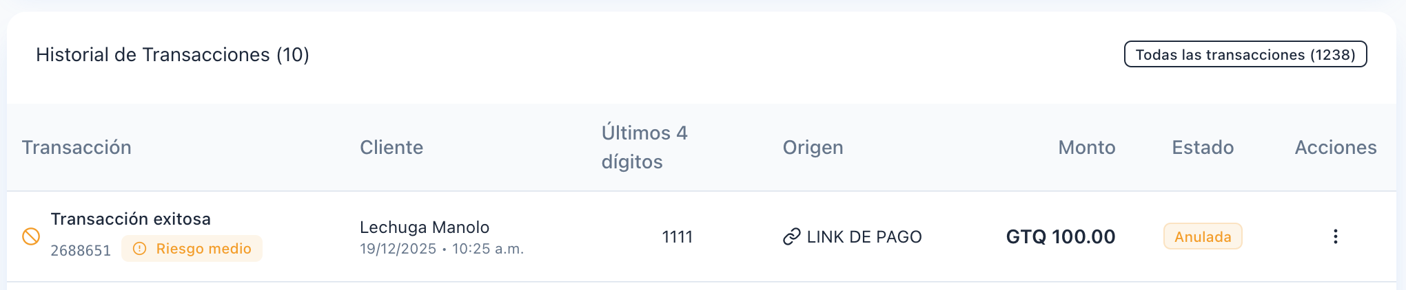 - Estado: Indica si la transacción se encuentra aprobada, rechazada o anulada.